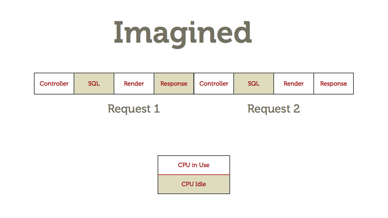Most obviously, early versions of Rails were not threadsafe. As a result, all Rails users were operating with a mutex around the entire request, forcing Rails to behave like the first "Imagined" diagram above. Annoyingly, Mongrel, the most common Ruby web server for a few years, hardcoded this mutex into its Rails handler. As a result, if you spun up Rails in "threadsafe" mode a year ago using Mongrel, you would have gotten exactly zero concurrency. Also, even in threadsafe mode (when not using the built-in Rails support) Mongrel spins up a new thread for every request, not exactly optimal.