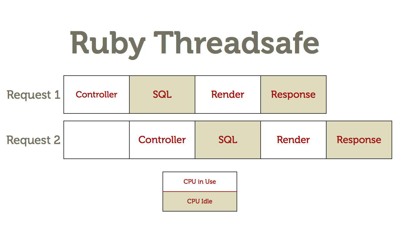 However, I'm pretty tired of hearing that threads (and especially Ruby threads) are completely useless, and if you don't use evented code, you may as well be using a single process per concurrent user. To be fair, this has somewhat been the party line of the Rails team years ago, but Rails has been threadsafe since Rails 2.2, and Rails users have been taking advantage of it for some time.