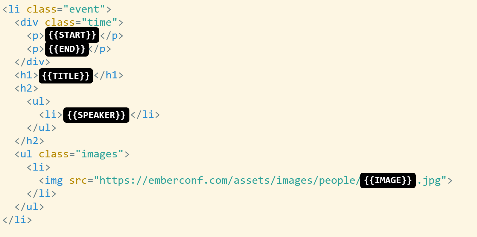 Because the component was defined in app/components/event.hbs, we use it as <Event>. We fill in the variables by specifying them just like HTML attributes, but with the @ prefix, which tells us that they're variables.