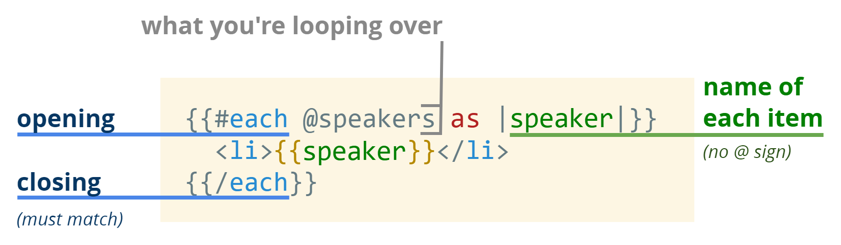 In order to use that list in the Event component, we'll need to learn one more piece of syntax. The #each syntax allows us to loop over arrays.