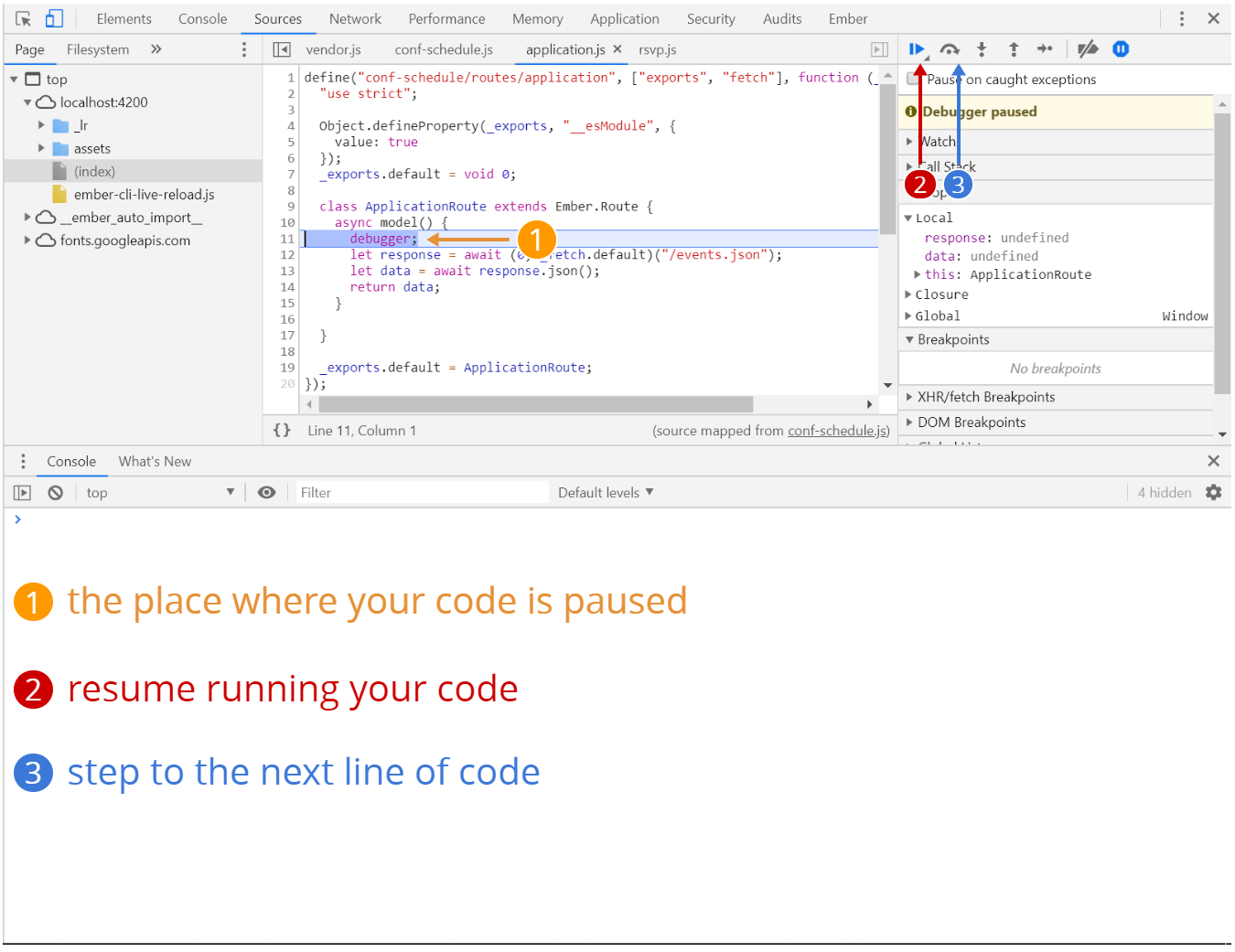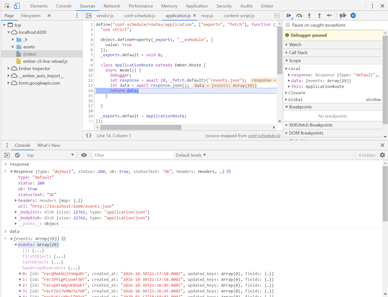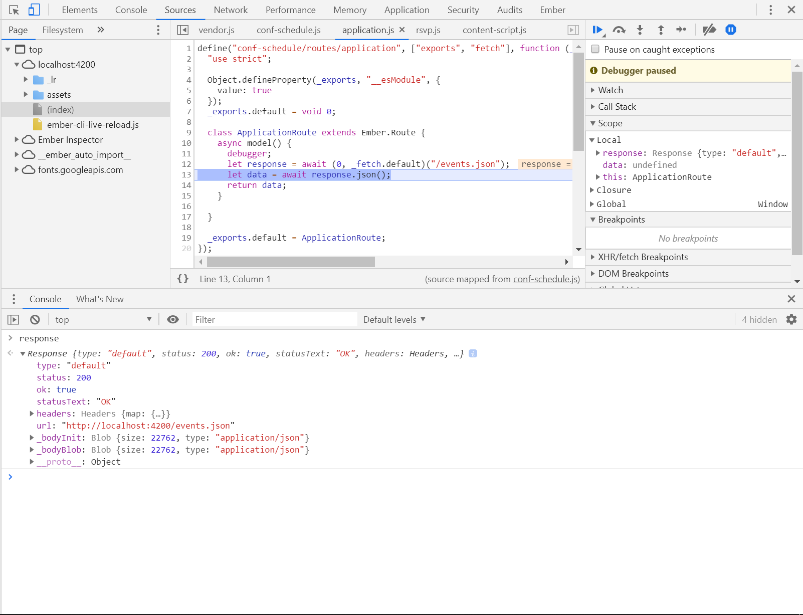 import fetch from "fetch". This brings the standard fetch library into your route module.async model. This creates a new method calledmodelinside of your route class. Ember expects to find a method namedmodelin your route, which it will call to get the model for your template. Theasyncprefix allows us to useawaitto wait for slow network requests inside this method.await fetch("/events.json"). This tells JavaScript to fetch theevents.jsonfile, and then wait until it's downloaded. Thefetchmethod is "asynchronous" (aka slow), so we need toawaitit.await response.json()says that we want to interpret theevents.jsonfile as JSON, so that we're giving a JavaScript object to our template, and not a string. The process of converting a raw response into JSON is also "asynchronous", so we need to await it.