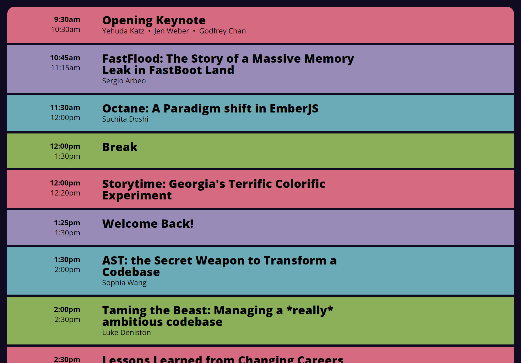 <Event @title="Octane: A Paradigm shift in EmberJS" @start="11:30am" @end="12:00pm"