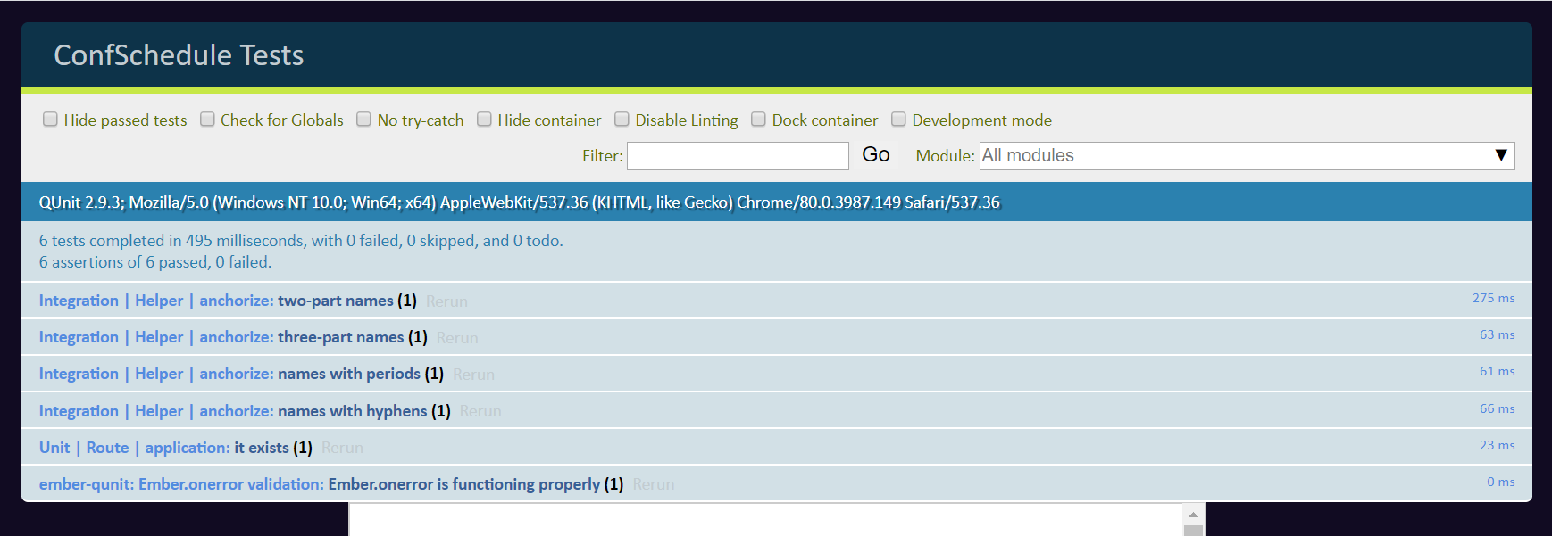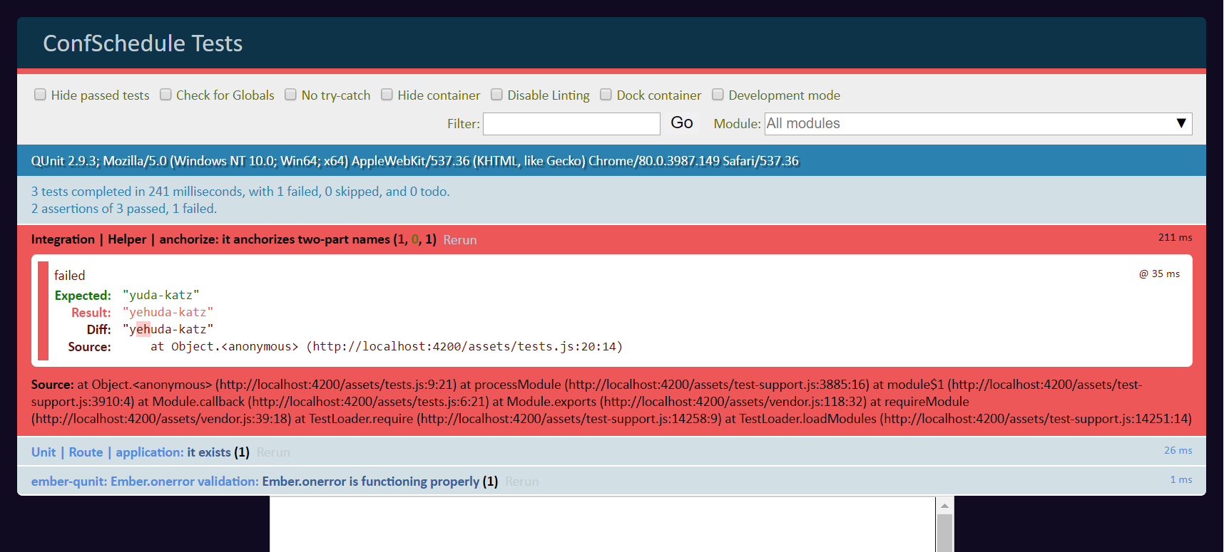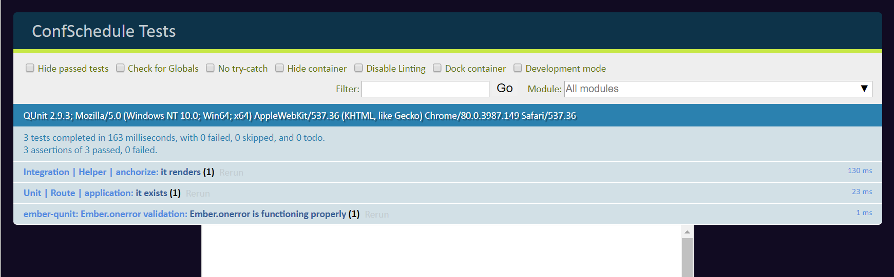 The easiest way to run our tests is to go to http://localhost:4200/tests in the browser.