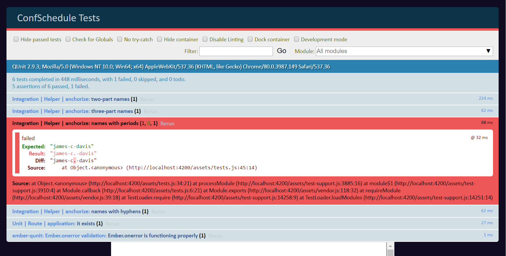 Just for good measure, let's break the anchorize method and see what happens to our tests. We'll remove the step that we added for "James C. Davis", which removed .s.